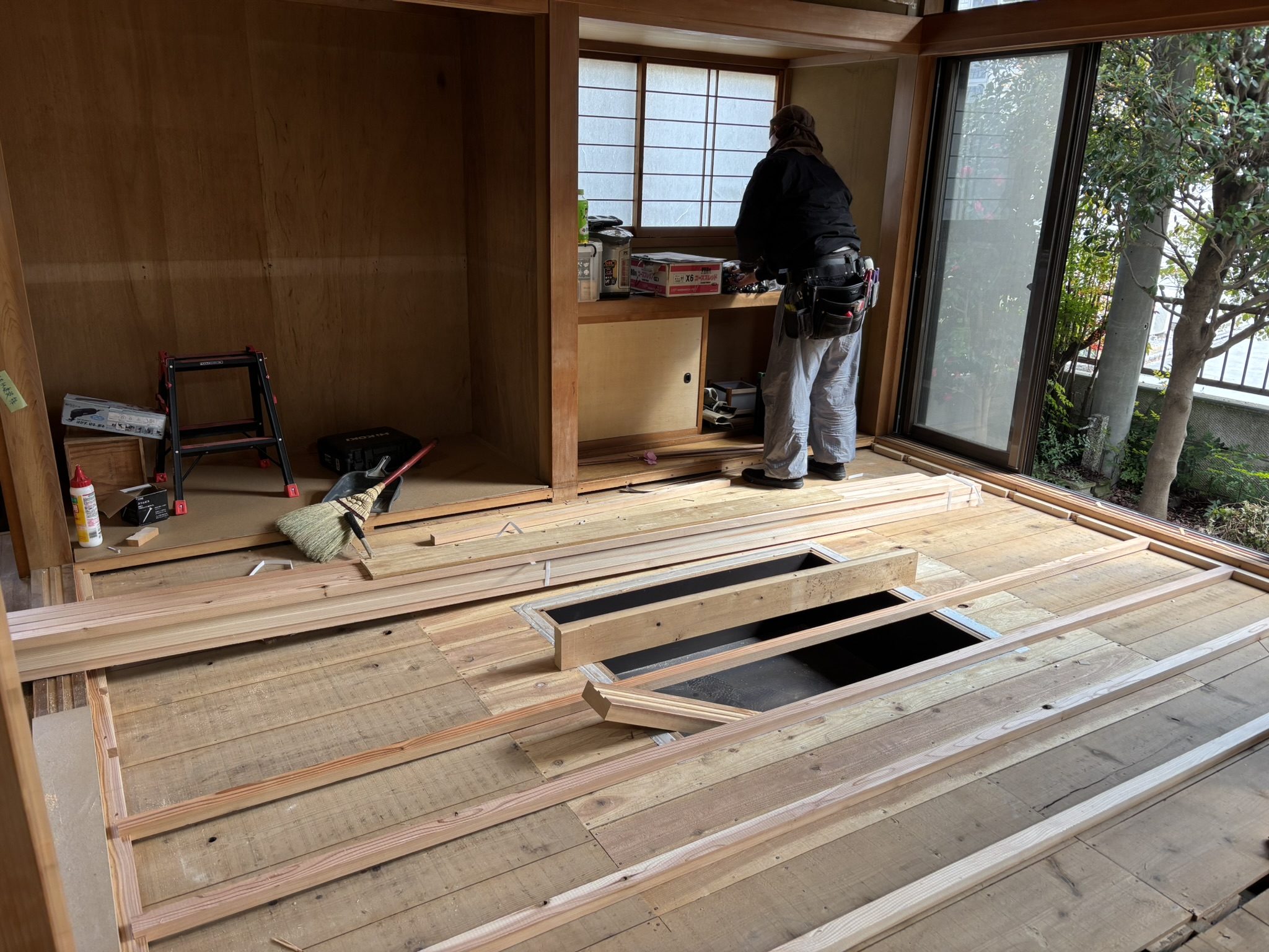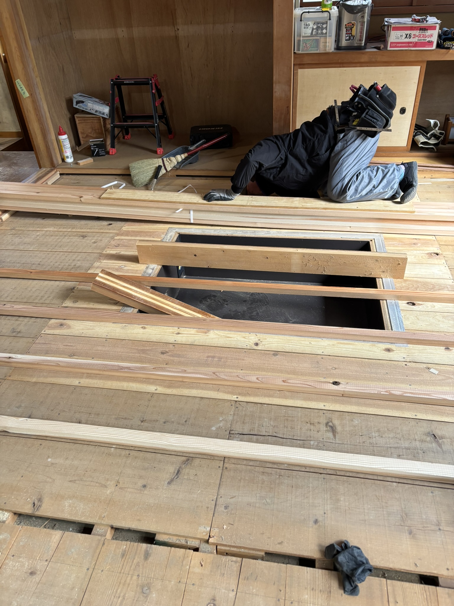 古くなって床も平らではなくなっているので齋藤大工さんがしっかり高さ調整。