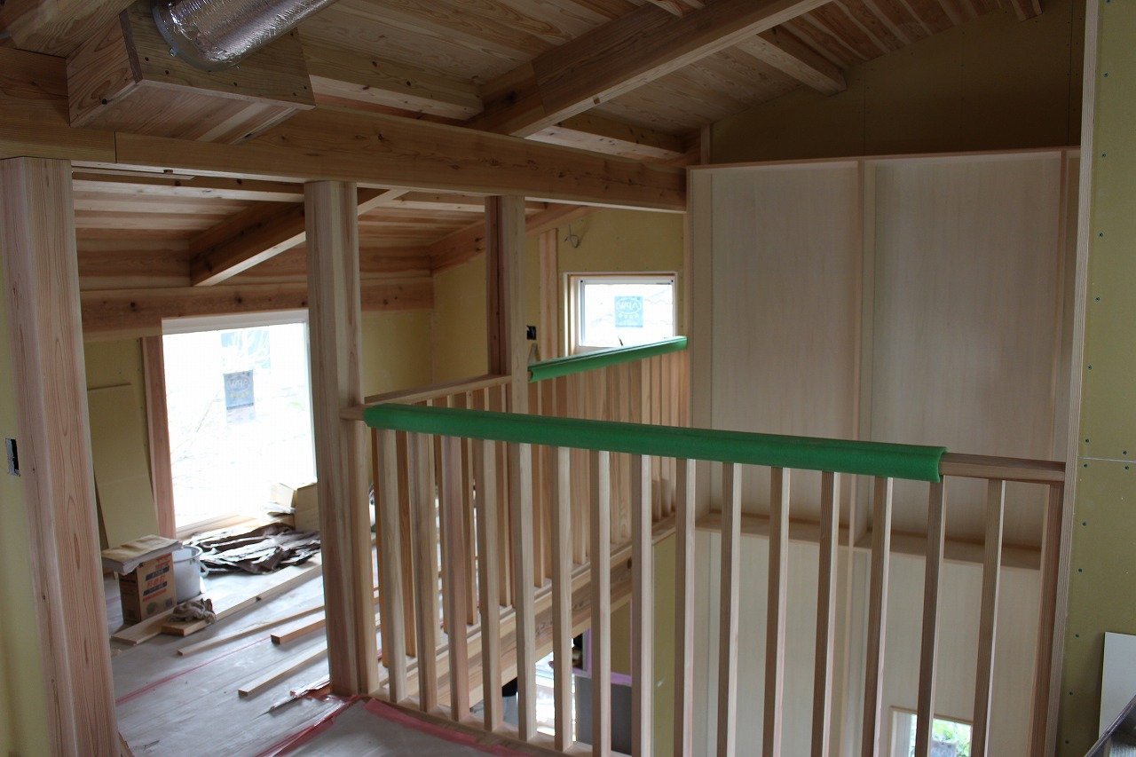 木工事が終わり、市川内装さんがオガファーザの下地処理です。