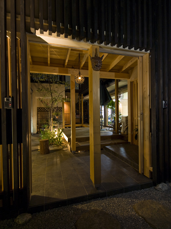 1階スペースに2台分のガレージを設計した住宅。構造・内装には西川材をふんだんに使用した大変心地よくも健康的な空間となりました。夜のライトアップも非常に奇麗で、雰囲気のある住宅です!