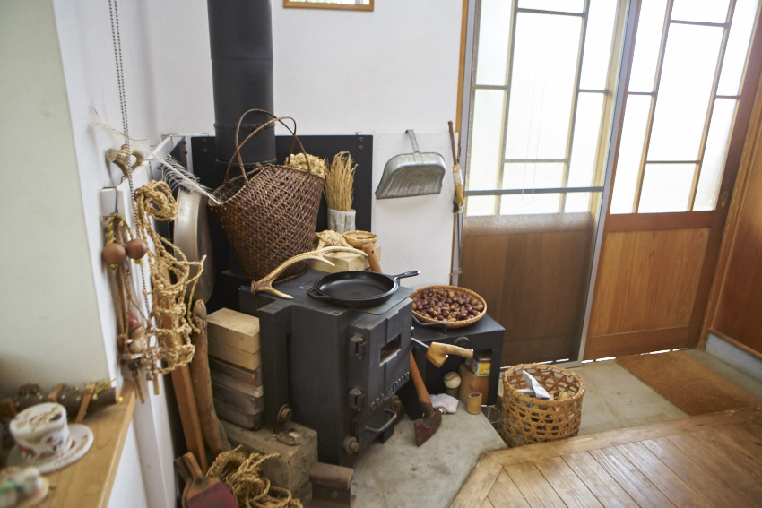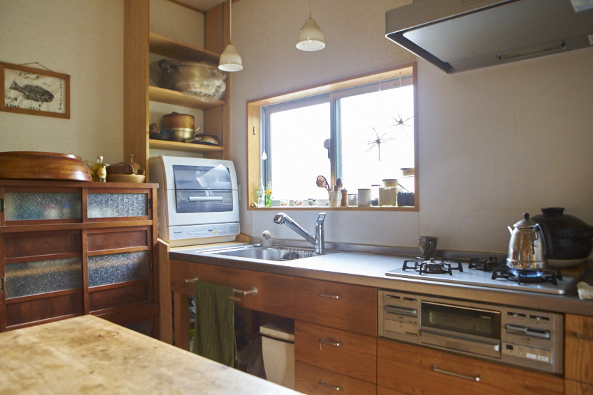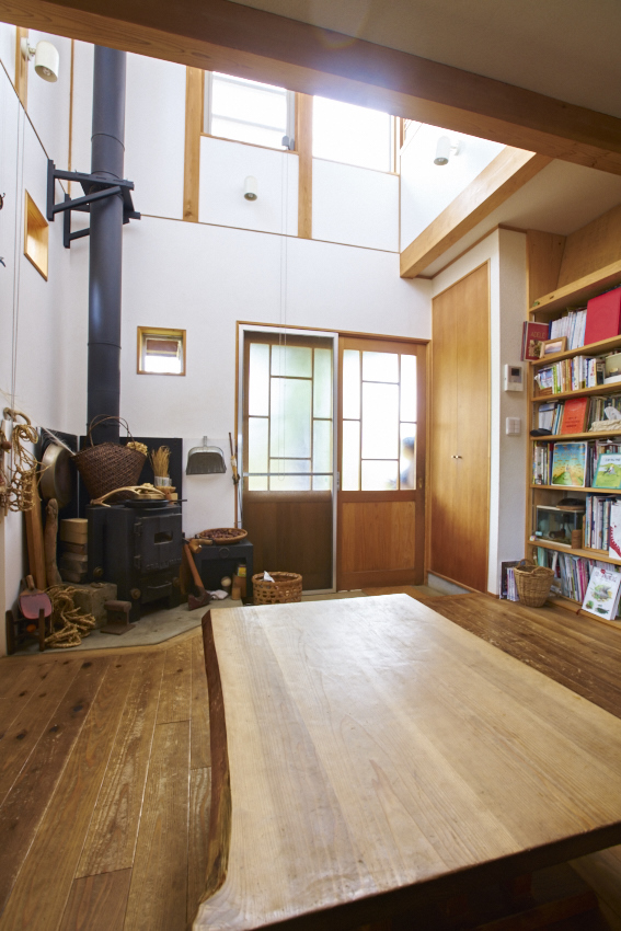 地元の材木、西川材を全面的に使用した二世帯住宅です。キッチンカウンターにも天然杉を使い、薪ストーブ設置で、こだわりの自然素材の家となっています。