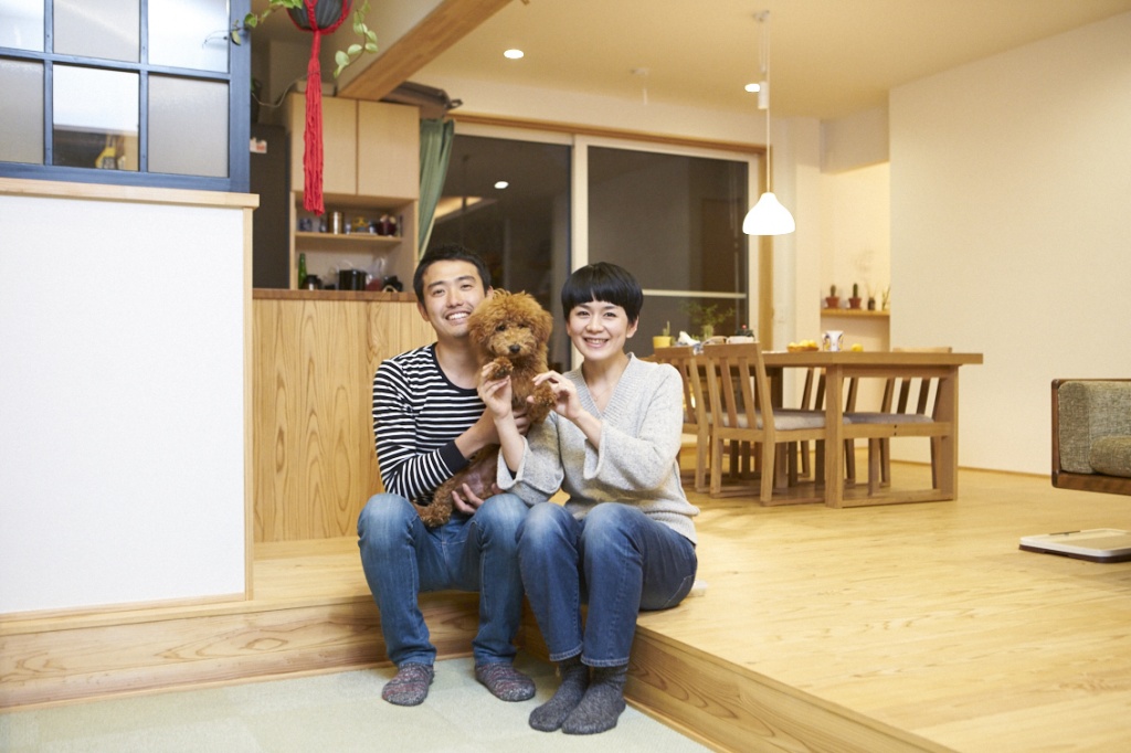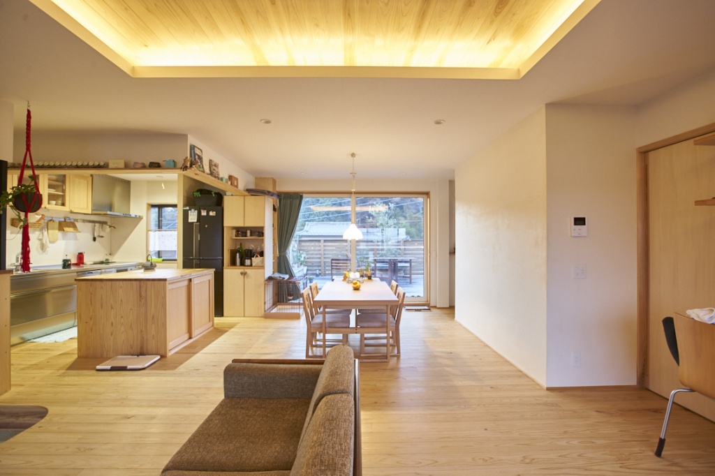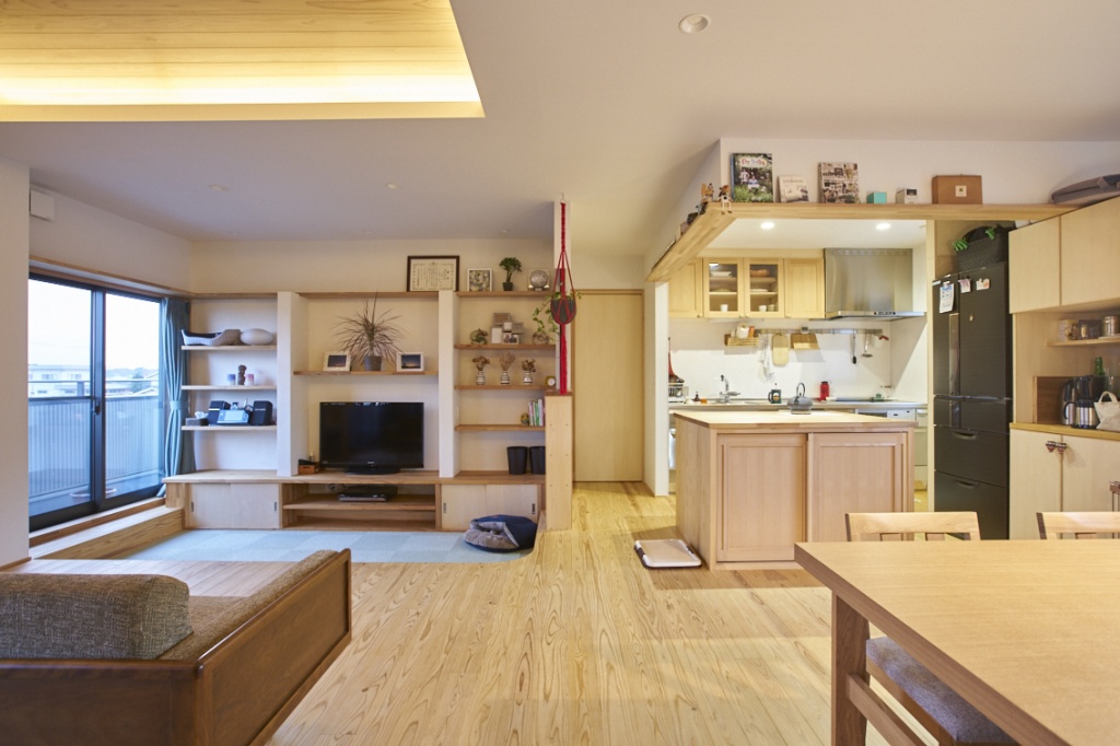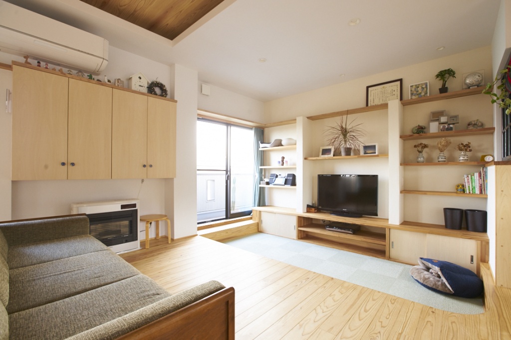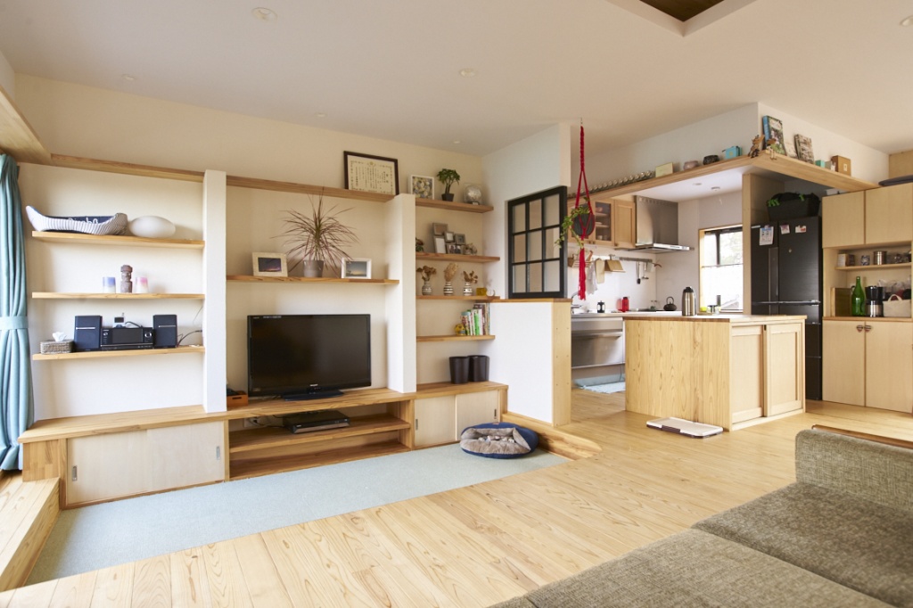 段差をつけたテレビ前の段差もこだわりの一つ。