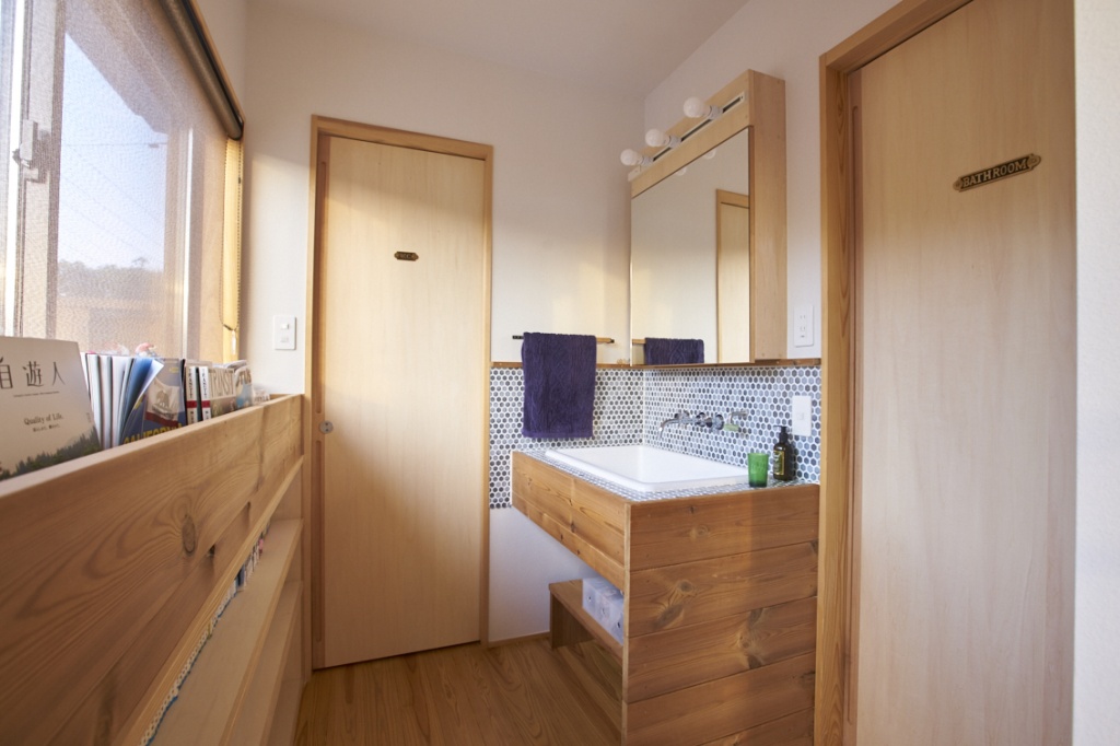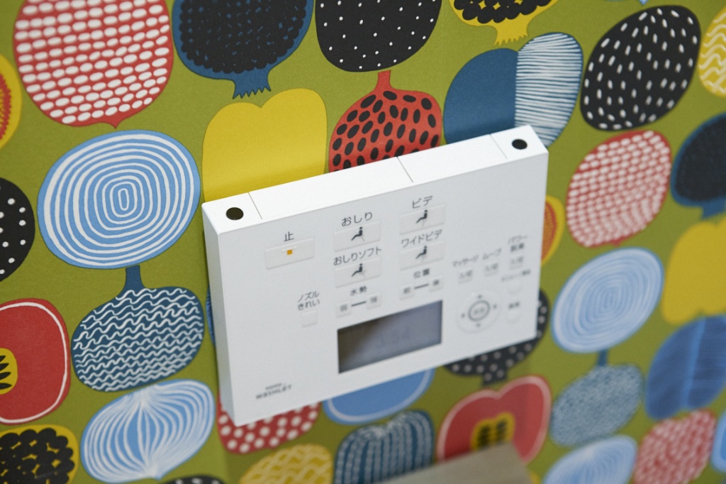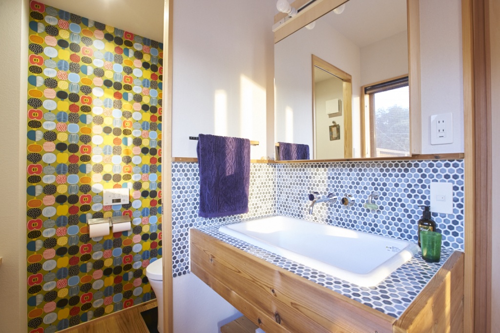 北欧デザインを取り入れたいと考え、お手洗いにはマリメッコの壁紙をあしらい、洗面スペースには、モザイクタイルを貼った。