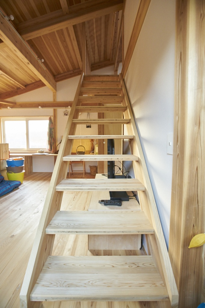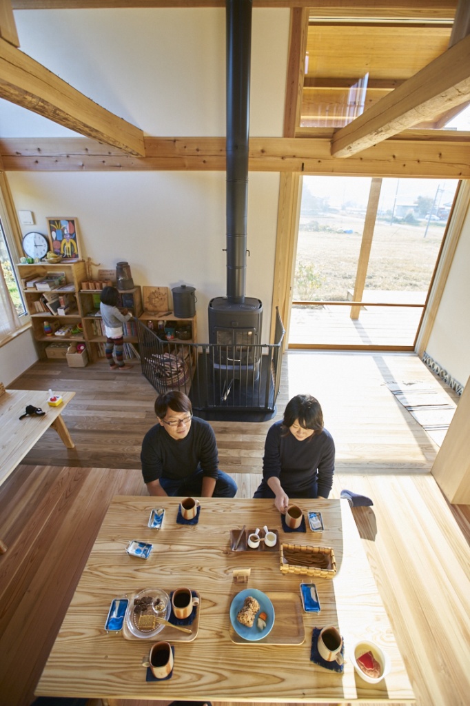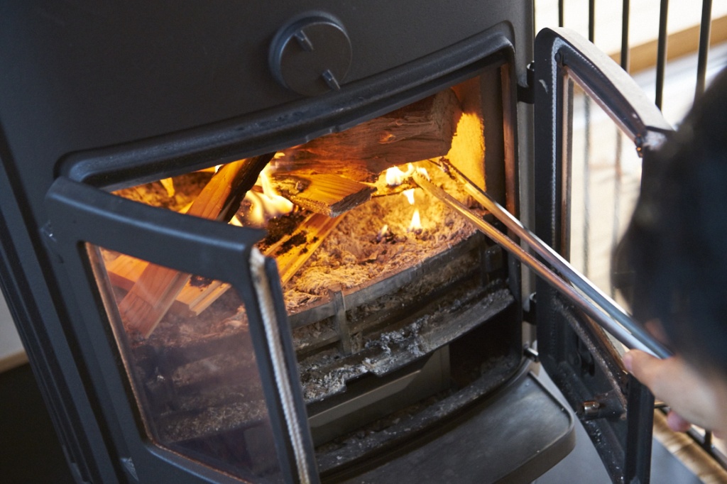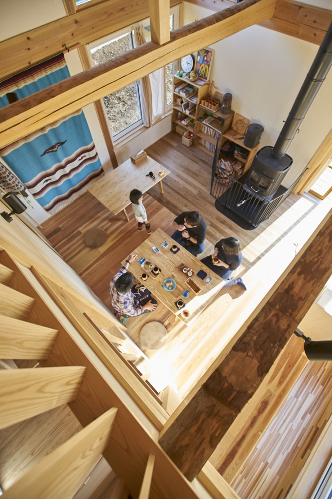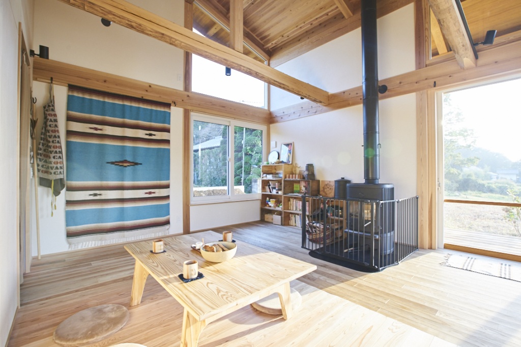 一階にカフェ兼用のキッチンとリビングがあり、薪ストーブと共に豊かな空間が広がっている。